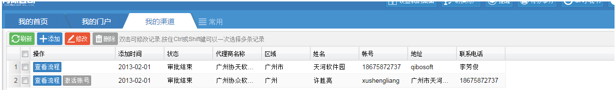 查看流程和激活帐号:是指流程审批通过后,渠道员工可以查看流程的审批情况,并可以激活帐号。 查看流程:指申请人可以查看流程的审批情况。 注意:[我的渠道]与工作流程相绑定,发起审批后,会直接按工作流程的表单和流程图进行审批,流程审批通过后,则审批生效。