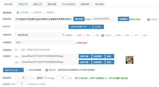 可以填写商品基本信息、销售信息、相关图片和各种属性。